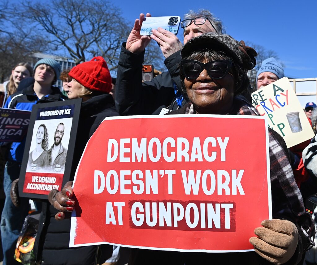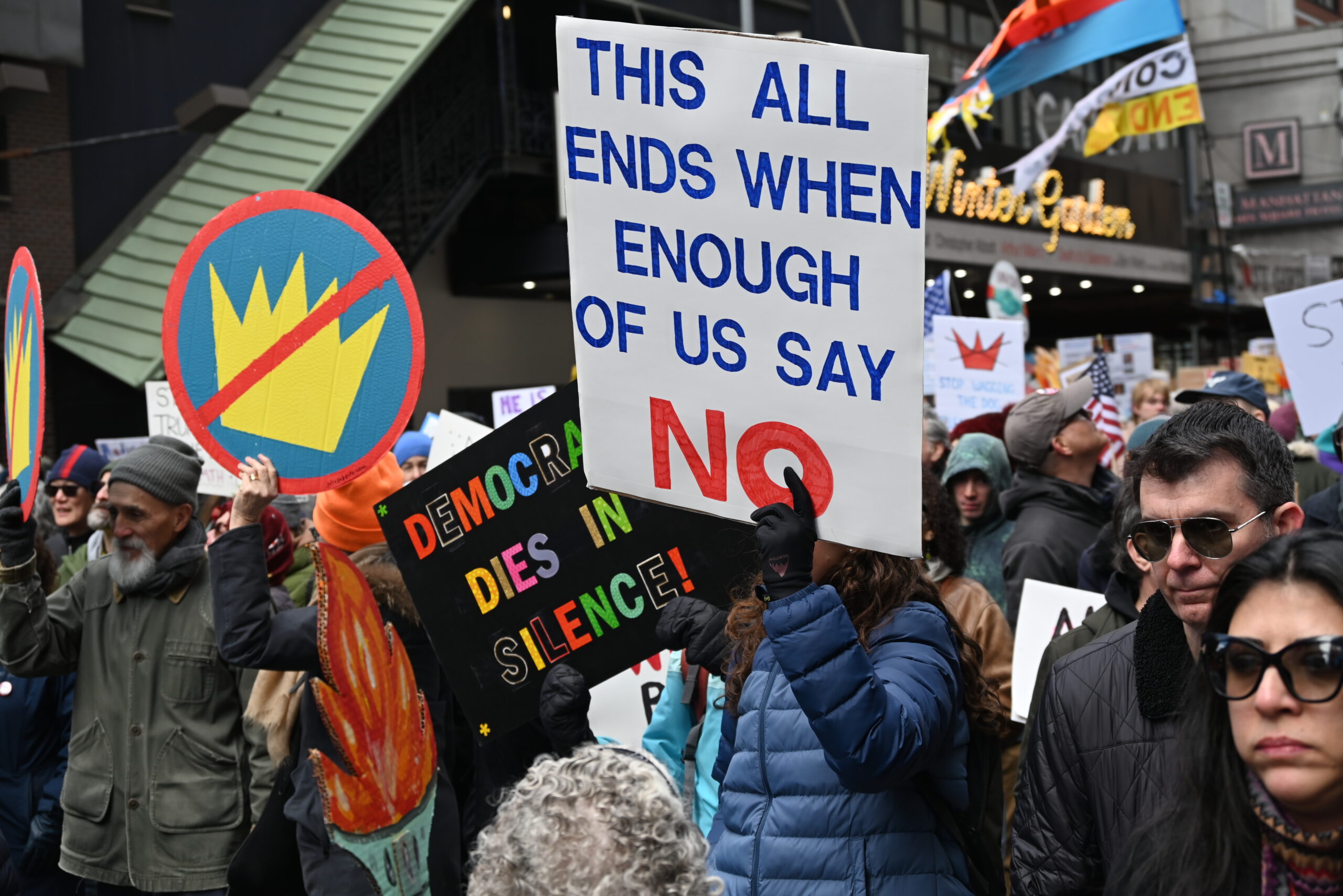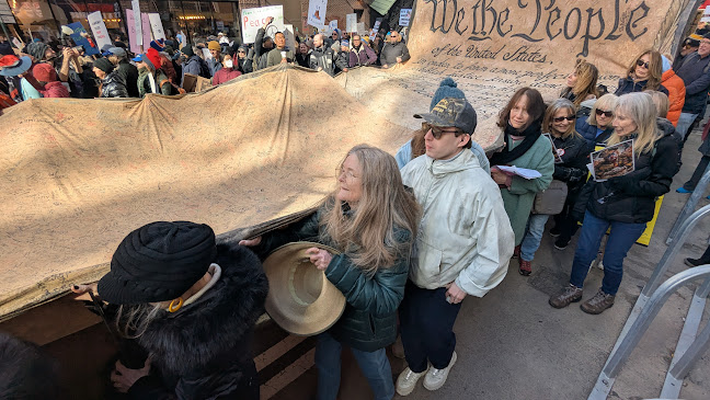 “We raise our voices against an administration that has ripped healthcare coverage away from millions of Americans, gutted disease research funding and environmental protections and has given unqualified individuals the power to make critical recommendations and place the health of our children in peril. We protest the administration’s rolling back of women’s rights and voting rights. We speak out against a war declared unconstitutionally, placing the lives of our military personnel at risk without first making the case to the American people; A war that is costing one billion dollars every day to wage while oil prices surge for families already struggling with soaring prices. Civil liberties are weakening, constitutional checks and balances are faltering and we are experiencing a significant and rapid decline in democratic norms. We the People will continue to stand up and speak out to save our democracy.